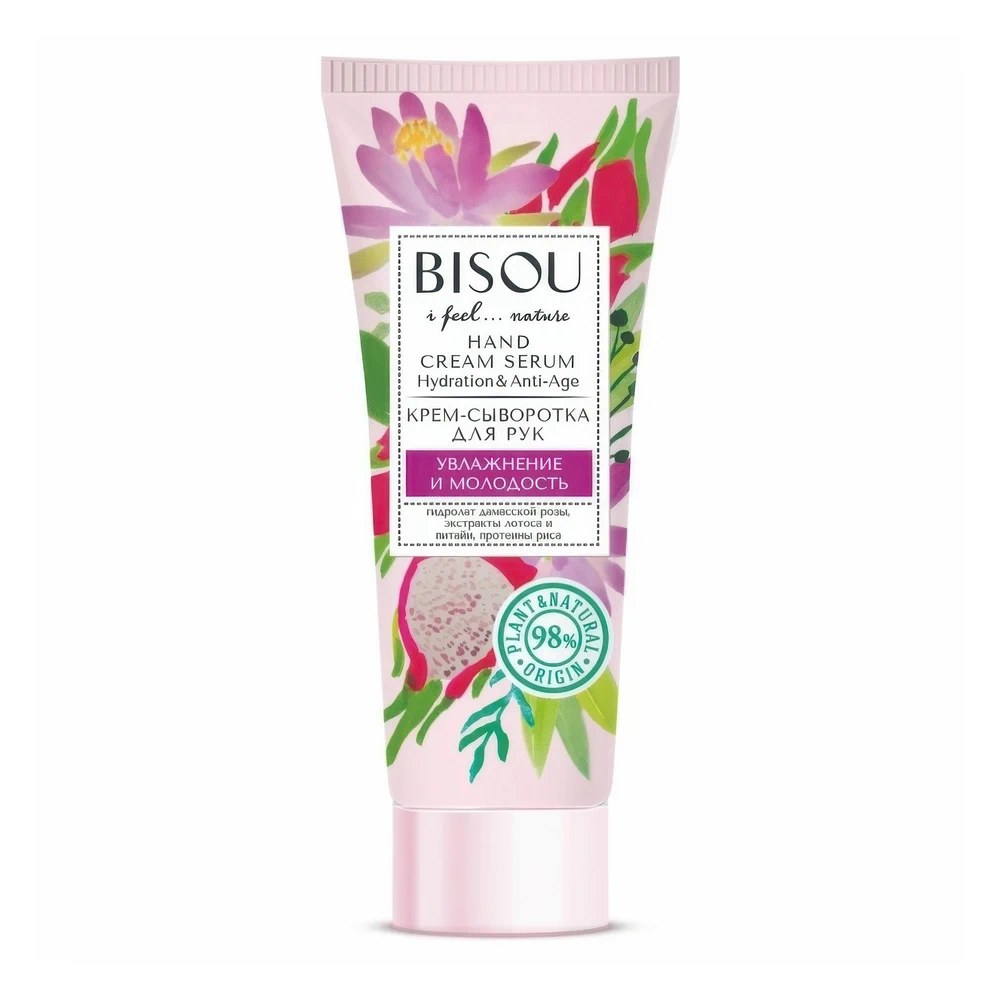 BISOU I Feel...nature Крем-сыворотка для рук Увлажнение и молодость – 75 мл. Этот крем-сыворотка сочетает в себе мощные увлажняющие и антивозрастные свойства, обеспечивая интенсивное питание и восстановление кожи рук. Легкая текстура быстро впитывается, не оставляя жирного следа, при этом глубоко увлажняя и разглаживая кожу. Содержит натуральные активные ингредиенты, которые способствуют улучшению эластичности и упругости кожи, делая руки более мягкими и молодыми. Подходит для ежедневного использования, особенно для сухой и зрелой кожи.