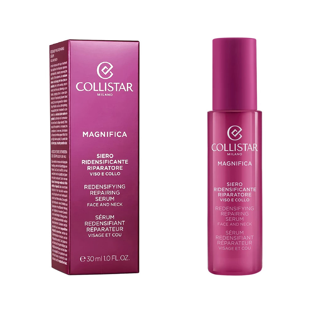 Collistar Magnifica Redensifyng Repairing Serum Face And Neck is an anti—aging serum for the face and neck. The product effectively improves the quality of the skin, increasing its elasticity. Thanks to the exclusive technology of releasing active ingredients, the serum is activated only after skin contact.