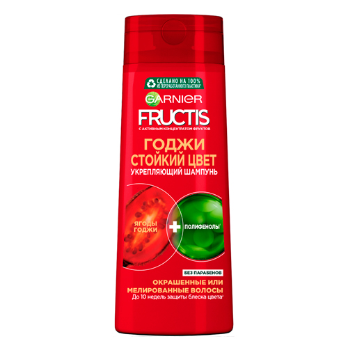 ОКРАШЕННЫЕ ИЛИ МЕЛИРОВАННЫЕ ВОЛОСЫ? Fructis представляет обновляющую систему, которая совмещает в себе суперфрукт натурального происхождения с активными ингредиентами. Ваши волосы выглядят более блестящими и сильными. Шампунь Годжи Стойкий цвет обогащен суперингредиентами: Формула с ягодами годжи и полифенолами питает и придает блеск волосам. Доказано! До 10 недель защита блеска окрашенных волос.