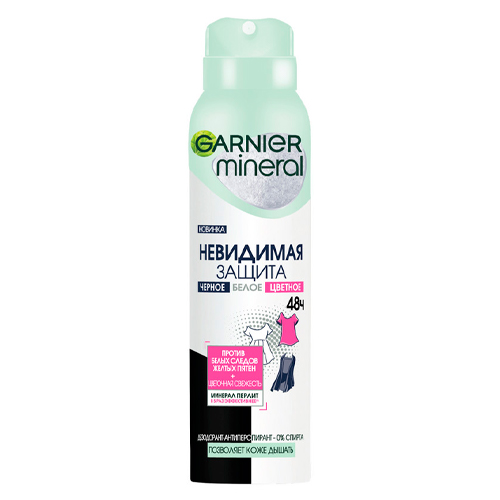 Garnier Дезодорант-антиперспирант спрей для тела Mineral Невидимая защита 48ч. Цветочная свежесть, Черное, Белое, Цветное, женский, 150 мл