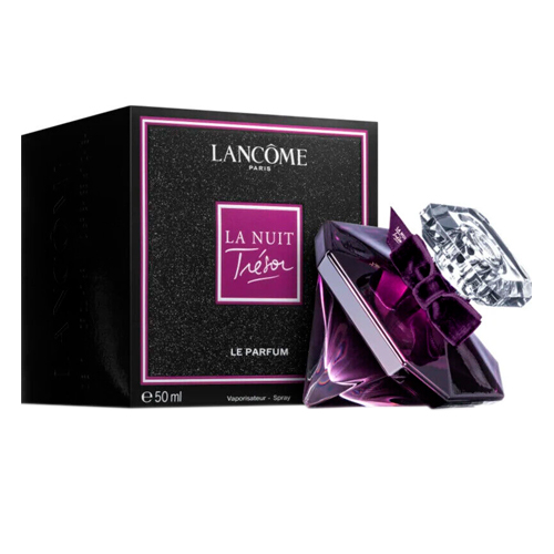 La Nuit Tresor Le Parfum is a subtle encounter between the collision of surprise and the tenderness of desired love. Le Parfum becomes a woman's most valuable accomplice, with whom you can delight the most expensive hours and secrets of the night, like the elixir of the absolute rose with bitter notes of cocoa. A new shade of black currant, lying between the aromas of green and red fruits, adding light and woody notes to rose and cocoa. Our new fragrance is enclosed in a diamond-shaped glass bottle, which shows sharp facets and powerful reflections of light through a purple veil wrapped in a velvet ribbon, emphasizing elegant desire.