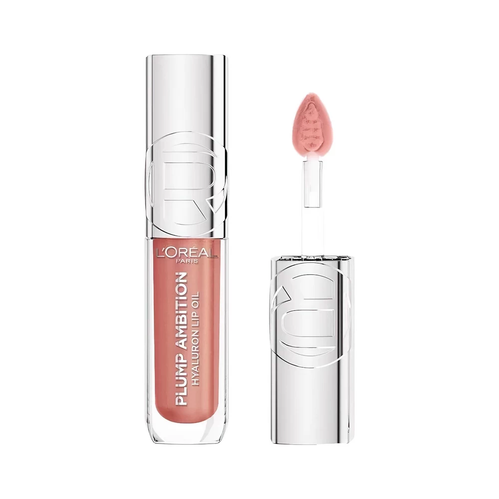 Plump Ambition Hyaluronic Lip Oil, shade 650 Nude Macaron — lip oil with hyaluronic acid for intense hydration and light volume. The light texture is quickly absorbed, softens and smoothes the lips, creating a comfortable feeling without stickiness.
