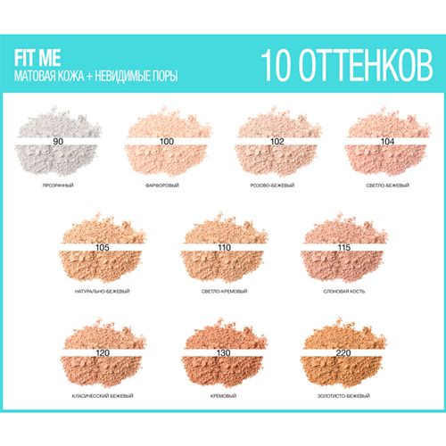 С пудрой Fit Me кожа выглядит ухоженной, свежей и матовой в течение всего дня! Формула, обогащенная минералом перлит, заметно матирует кожу, скрывает поры и несовершенства и помогает контролировать жирный блеск. Нежная тающая текстура равномерно распределяется. Легкое покрытие позволяет коже дышать, не оставляет ощущения сухости. Пудра FIT ME сохраняет стойкость до 14 часов*. Водостойкая. Подходит для всех типов кожи, даже для чувствительной. *Потребительский тест, 61 респондент.