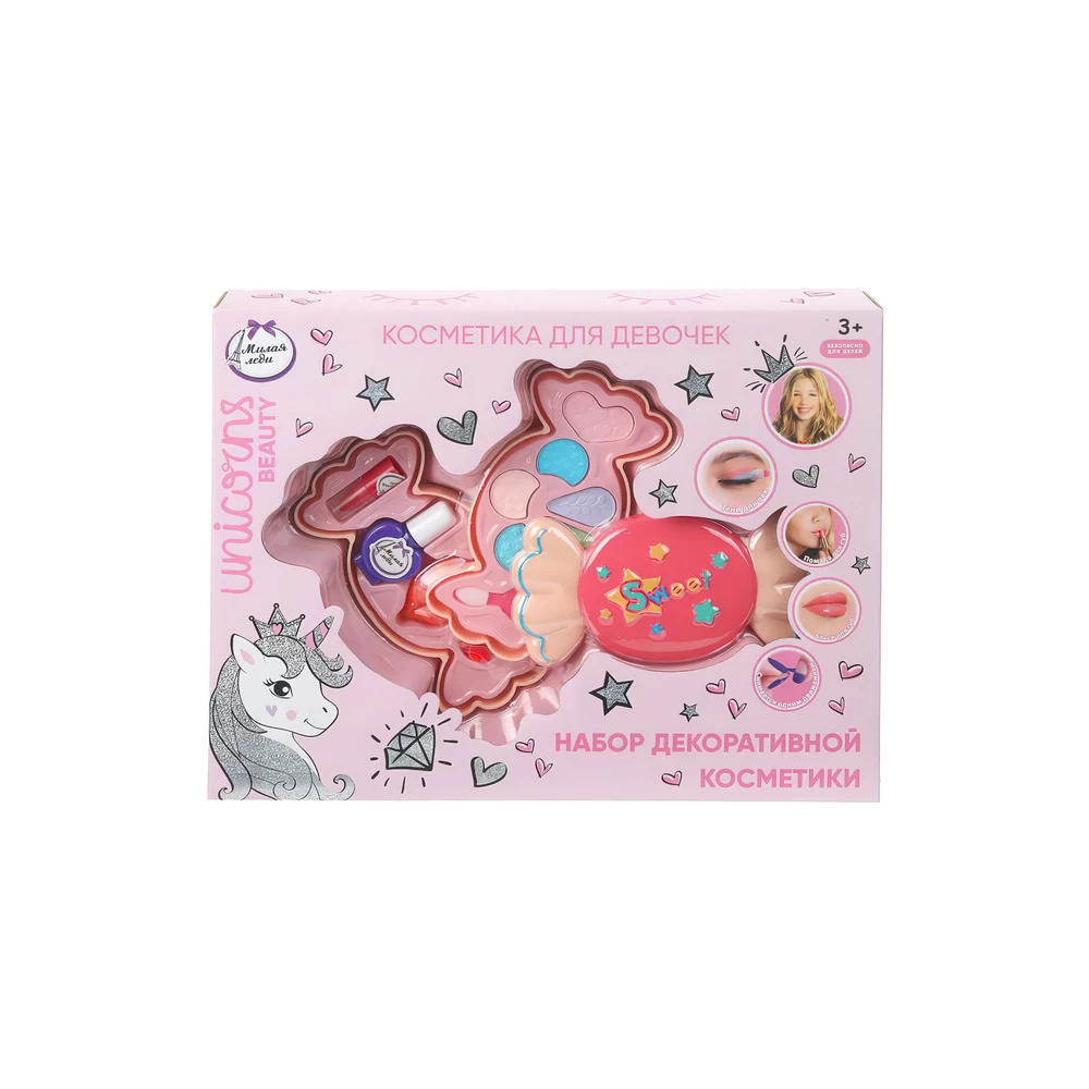 Девочки в любом возрасте хотят быть красивыми. Специально для юных модниц был разработан этот набор декоративной косметики, состоящий из теней для век, лака для ногтей, помады и блеска для губ. Маленькая принцесса обязательно оценит яркие цвета и модную упаковку с милым единорогом. Развивайте чувство стиля и вкуса, учите девочку создавать свой неповторимый образ вместе с косметикой ТМ «Милая леди».