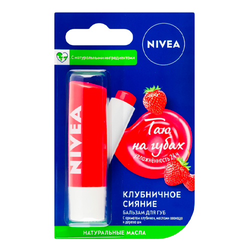 Твои губы мягкие, увлажненные и ароматные вместе с бальзамом для губ Клубничное сияние от Nivea. Сохраняет губы мягкими и нежными Бережно увлажняет Содержит масла авокадо и дерева ши Без минеральных масел Мгновенно тает на губах Оставляет волшебный оттенок и блеск