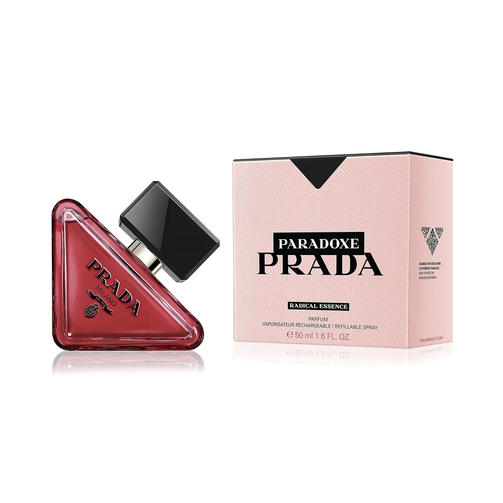 Prada Paradoxe Radical Essence Parfum is a floral gourmet fragrance for women, released in 2025. The perfumers are Nadège Le Garlantezec, Shyamala Maisondieu and Antoine Maisondieu. The perfume has expanded the Paradoxe collection in iconic triangular bottles with the most intense, deep and refined version of the paradoxical combination of the most beautiful olfactory notes with a consistently magnificent result.