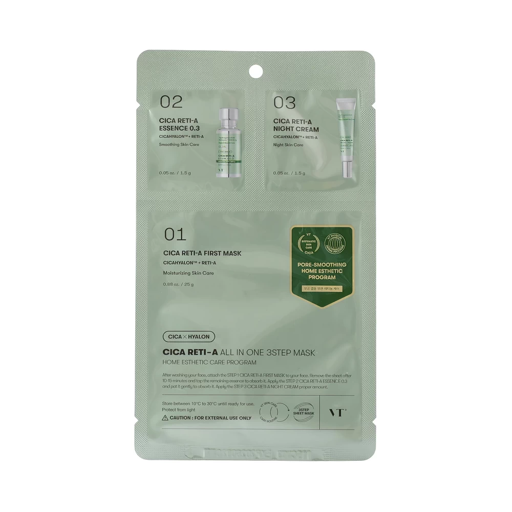 VT Cica Reti-An All In One 3Step Mask Three—step face mask with retinol and Centella Asiatica (28 ml) - multifunctional care in one set. It includes three consecutive stages: an essence for skin preparation, a fabric mask with retinol and centella for renewal and restoration, as well as a cream to consolidate the effect and protect the skin.
