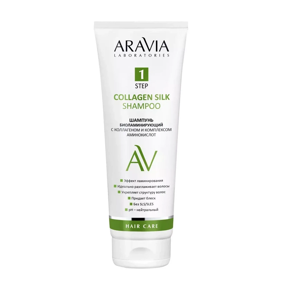 ARAVIA Шампунь биоламинирующий с коллагеном и комплексом аминокислот Collagen Silk Shampoo — это интенсивный уход за вашими волосами. Формула шампуня, обогащенная коллагеном и аминокислотами, обеспечивает глубокое восстановление структуры волос, придавая им силу и блеск. Биоламинирование помогает разгладить волосы, делая их более послушными и мягкими. Идеален для поврежденных и ослабленных волос. Объем: 250 мл.