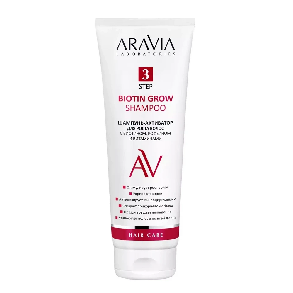 ARAVIA Шампунь-активатор для роста волос с биотином, кофеином и витаминами Biotin Grow Shampoo — это специализированный шампунь, разработанный для стимуляции роста волос. Содержит биотин, кофеин и витамины, которые активизируют фолликулы волос, укрепляют их и улучшают микроциркуляцию кожи головы. Шампунь помогает уменьшить выпадение волос, улучшает их структуру и придаёт им здоровый вид. Подходит для ежедневного применения для поддержки и укрепления волос. Объем: 250 мл.