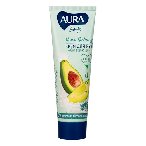 Крем для рук AURA BEAUTY обогащающий 75мл Обогащающий крем для рук Aura Beauty глубоко питает кожу. Масло авокадо восполняет недостаток липидов в коже и восстанавливает ее защитный барьер. Специальная формула крема с комплексом натуральных компанентов - для здоровой и нежной кожи рук на каждый день.