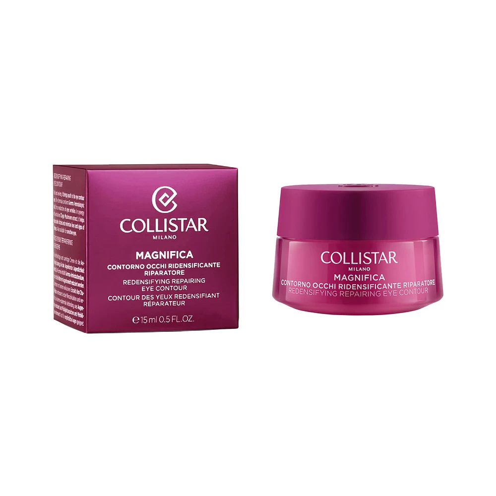 Collistar Magnifica Redensifyng Repairing Eye Contour Cream – антивозрастный крем для контура глаз. Он устраняет темные круги и отечность под глазами, делает менее выраженными морщинки. Средство с насыщенной бархатистой консистенцией можно использовать в качестве еженедельной маски для контура глаз.