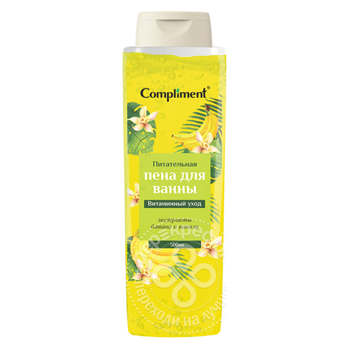 Воздушная пена для ванны Compliment бережно окутает Вас легким ароматом, даря истинное удовольствие и эффективный уход. Богатая витаминами пена нежно очищает, успокаивает и восстанавливает кожу. Всего несколько минут, проведенных в ванне с мягкой пеной, помогут вернуть внутренние силы и состояние гармонии. Экстракт банана, обладая выраженными питательными и тонизирующими свойствами, насыщает кожу полезными микроэлементами, возвращая мягкость и бархатистость даже сухой коже. Насыщенный аромат ванили и сладкого банана улучшит настроение и снимет напряжение после трудового дня.