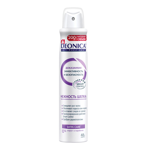 Современный антиперспирант DEONICA НЕЖНОСТЬ ШЕЛКА благодаря входящему в состав натуральному экстракту замедляет рост нежелательных волос и обеспечивает надежную защиту и свежесть на 48 часов. После применения антиперспиранта на протяжении месяца новые волоски начинают расти медленнее, становятся тоньше, а при условии регулярной эпиляции приобретают округлые края.
