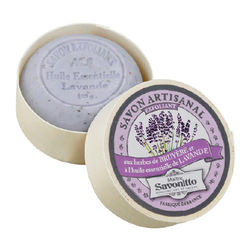 Отшелушивающее мыло с ароматом лаванды, отшелушивающее средство с запахом вереска. Поставляется в коробке из французского или европейского тополя