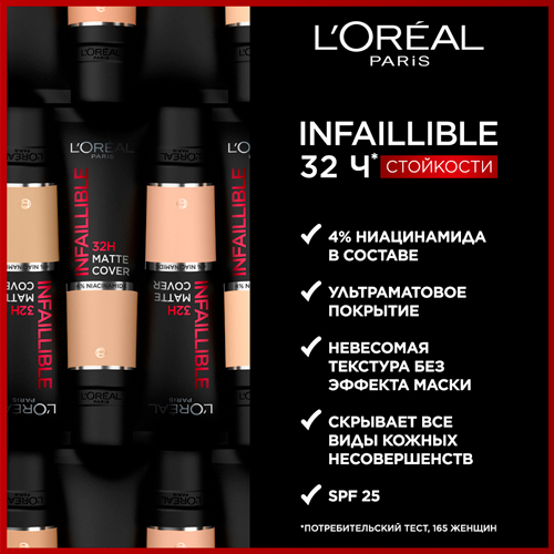 Матирующий cтойкий тональный крем Infaillible Matte Cover [Инфаибль Мат Кавер] 32 часа работает на твою кожу и заметно улучшает ее состояние. Он создает стойкое ровное матовое покрытие, без эффекта маски! Формула с 4% ниацинамида в составе выравнивает тон кожи и маскирует все виды кожных несовершенств. SPF 25. Невесомая текстура матирующего тонального крема легко наносится и равномерно распределяется на коже. Стойкий тональный крем Infaillible 32Ч Матовое Покрытие держится в течение всего дня, ощущается ультралегким и дышащим на коже.
