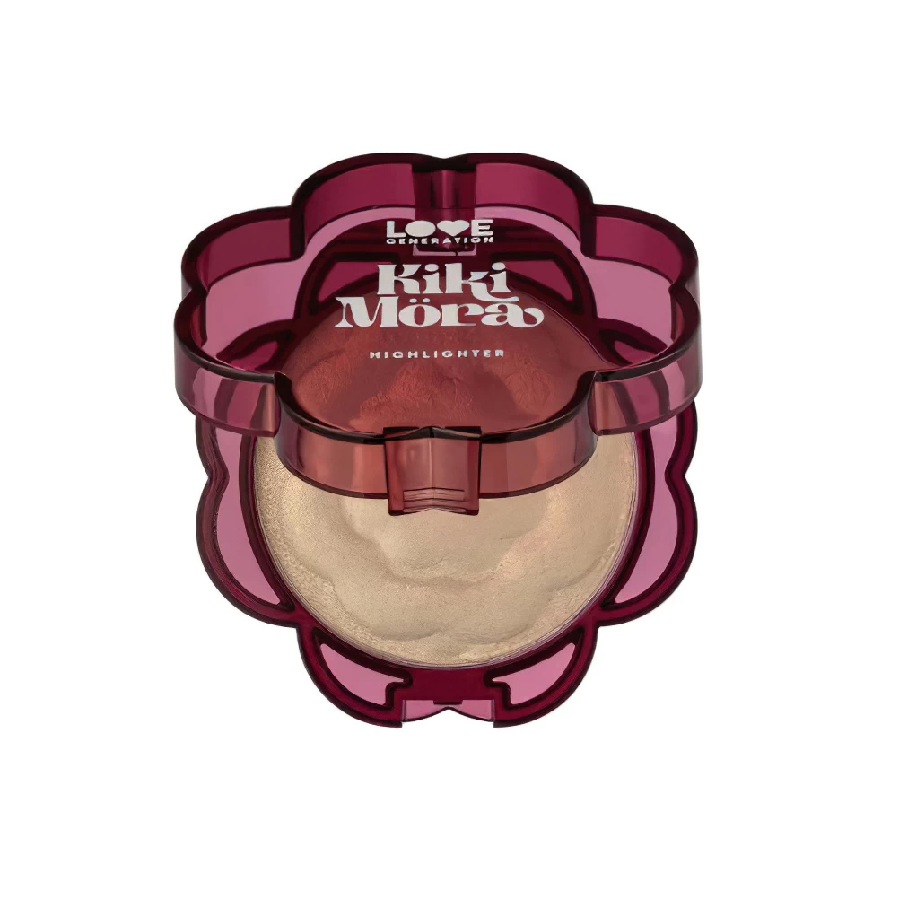 Компактный хайлайтер KIKIMORA в упаковке в форме цветочка. Полумуссовая шелковистая текстура легко набирается на кисть и мягко ложится на кожу, а мелкие сияющие частицы ловят свет под разными углами, создавая деликатное, но заметное свечение без намека на крупный шиммер.