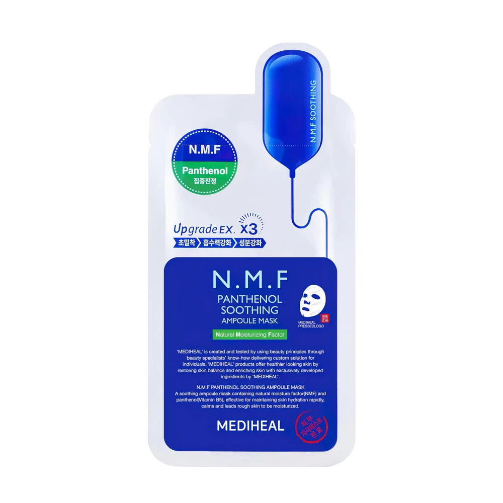 MEDIHEAL NMF PANTENOL SOOTHING AMPOULE MASK — успокаивающая ампульная тканевая маска, обогащенная пантенолом и увлажняющим комплексом NMF (Natural Moisturizing Factor). Интенсивно насыщает кожу влагой, способствует восстановлению защитного барьера, снимает раздражения и дискомфорт. Пантенол помогает ускорить регенерацию и улучшить эластичность кожи, а комплекс NMF удерживает влагу в глубоких слоях, предотвращая сухость. После применения кожа становится мягкой, гладкой и свежей, с ровным и ухоженным видом.