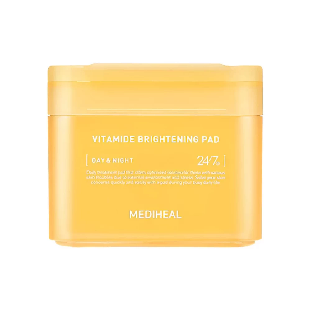 MEDIHEAL VITAMIDE BRIGHTENING PAD — осветляющие тонер-пэды, пропитанные витаминным комплексом (в том числе витамином C и ниацинамидом), которые помогают выровнять тон кожи, придать ей здоровое сияние и свежесть. Мягкая текстура дисков бережно отшелушивает ороговевшие клетки, улучшая впитывание последующего ухода. Регулярное использование помогает уменьшить тусклость, следы усталости и пигментацию, делая кожу более ровной и гладкой. Подходят для ежедневного применения.