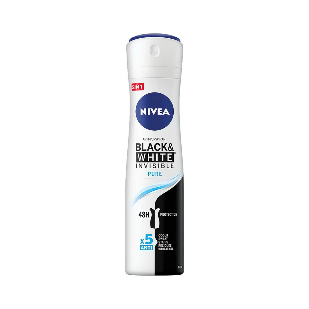 Дезодорант-антиперспирант спрей NIVEA Черное и Белое Невидимый Pure предотвращает появление белых пятен на темной одежде и желтых пятен на светлой одежде. Черная одежда остается черной, а белая одежда дольше остается белой.