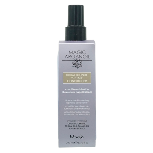 NOOK MAGIC ARGANOIL RITUAL BLONDE 2-Phase Conditioner Мгновенно увлажняет и питает светлые, осветленные, обесцвеченные и мелированные волосы без утяжеления. Регенерирует волосы, придает шелковистость, блеск и мягкость. Устраняет пушистость, облегчает расчесывание. Защищает волосы от механических повреждений и неблагоприятного воздействия окружающей среды. Благодаря фиолетовым микропигментам нейтрализует нежелательные желтые оттенки и усиливает сияние светлых волос. СОДЕРЖИТ: Аргановое масло • Регенерирует поврежденную структуру, увлажняет волосы без утяжеления • Помогает восстановить естественный липидный барьер волос, делает их более сильными, шелковистыми и блестящими • Защищает волосы от воздействия свободных радикалов, термических и механических повреждений, неблагоприятных факторов окружающей среды • Повышает эластичность волос