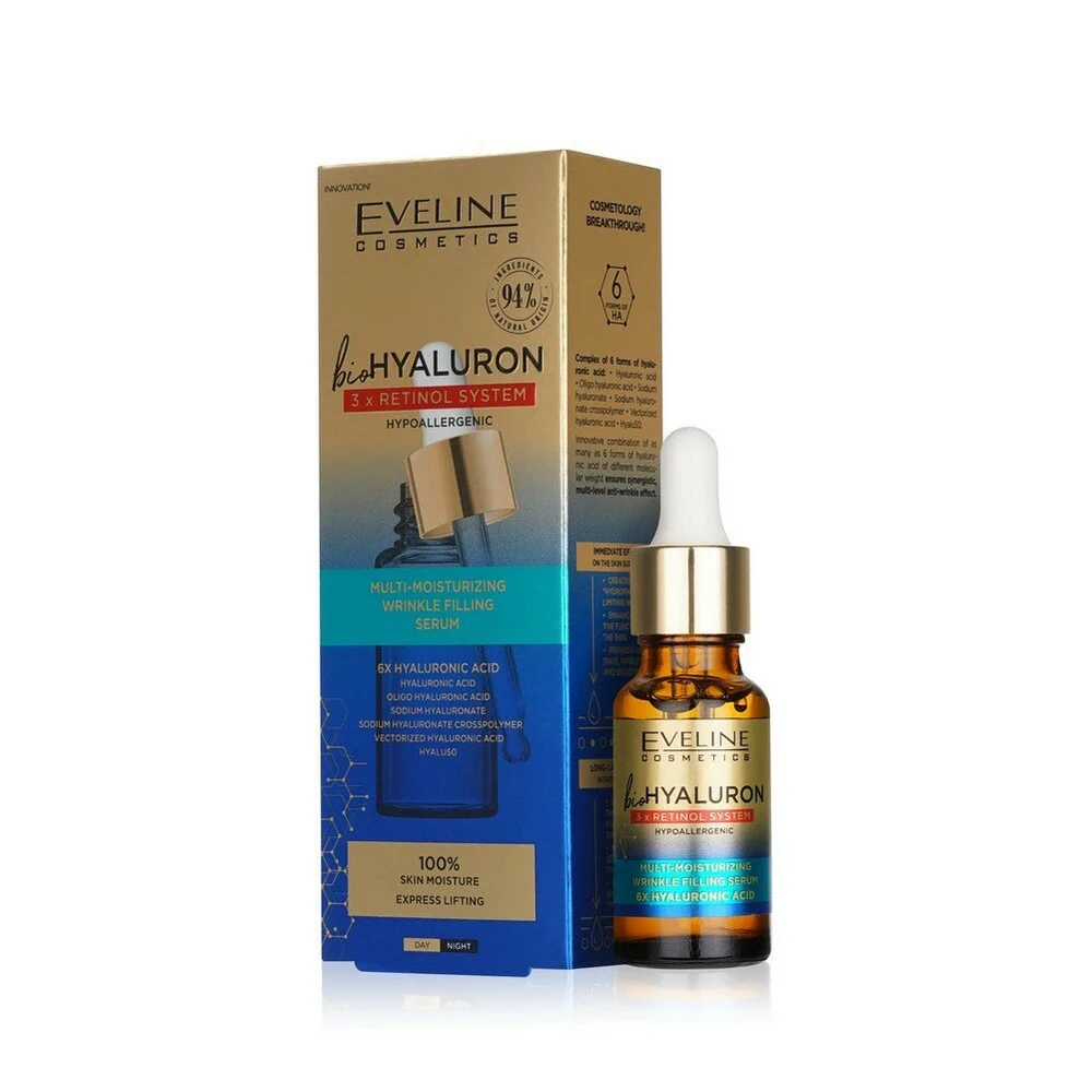 СЫВОРОТКА ДЛЯ ЛИЦА EVELINE BIOHYALURON 3X RETINOL SYSTEM ГИПОАЛЛЕГРЕННАЯ ЗАПОЛНЯЮЩАЯ МОРЩИНЫ МУЛЬТИУ