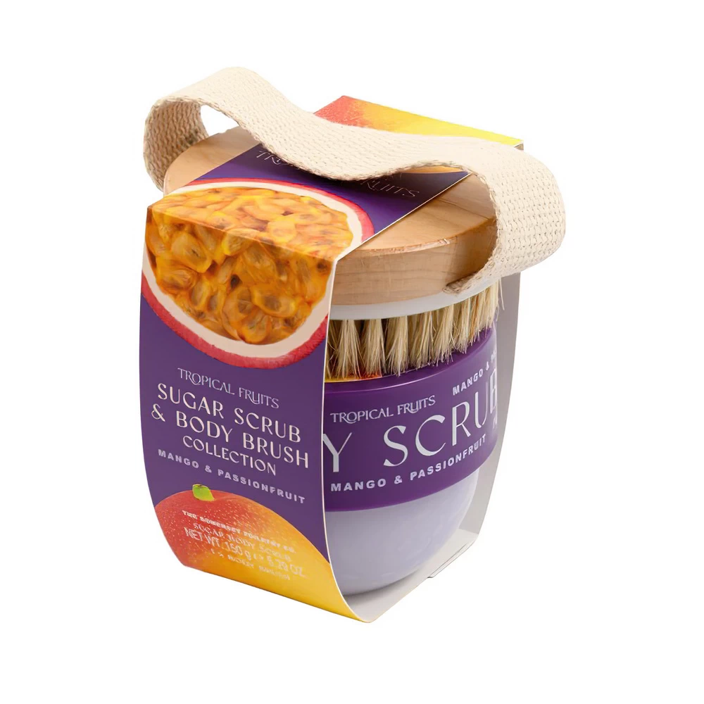 Tropical Fruit Mango & Passionfruit 150g Body Scrub & Brush Set Нежный отшелушивающий сахарный скраб и щетка Манго и маракуйя 150г