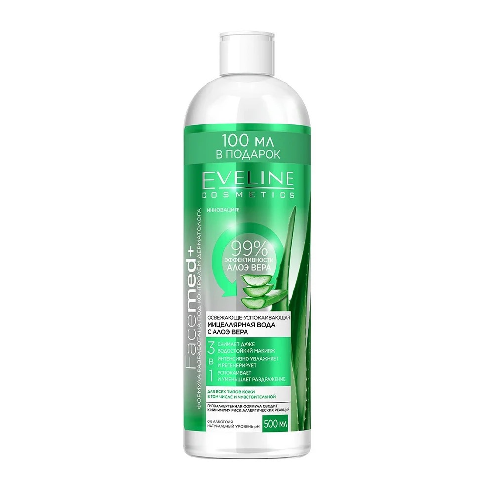 ВОДА МИЦЕЛЛЯРНАЯ ДЛЯ ЛИЦА EVELINE FACEMED+ ОСВЕЖАЮЩЕ УСПОКАИВАЮЩАЯ АЛОЭ ВЕРА 3В1 500МЛ