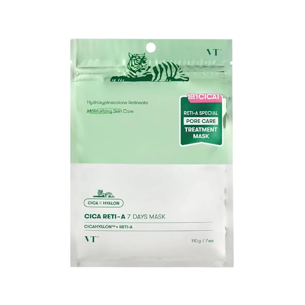 VT Cica Reti-A 7 Days Mask Набор тканевых масок с центеллой и ретинолом (7 шт.) — курс из семи масок для интенсивного ухода и восстановления кожи. Ретинол способствует обновлению клеток, разглаживанию морщин и улучшению текстуры кожи, а экстракт центеллы азиатской успокаивает, снимает раздражения и укрепляет защитный барьер.