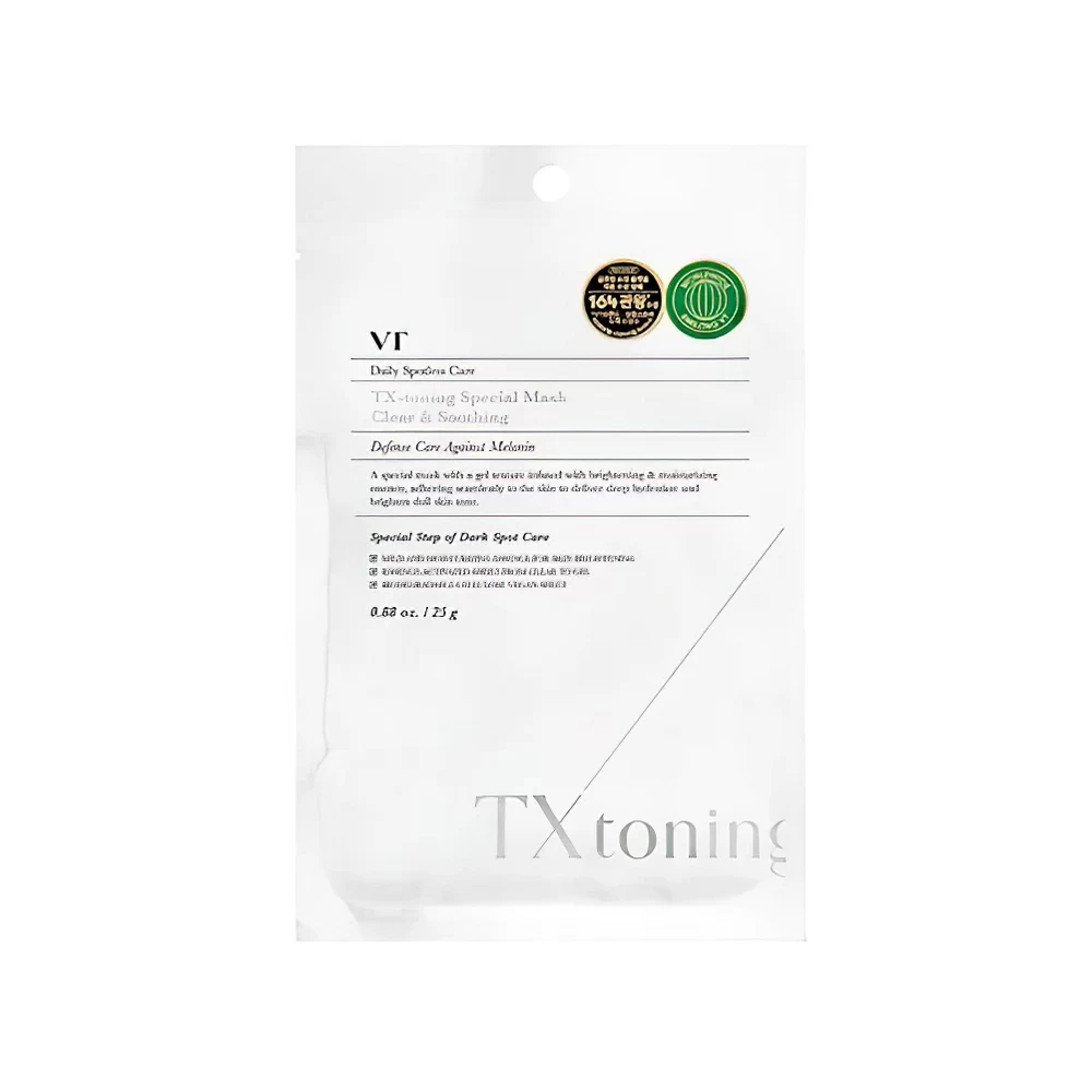 VT TX-Toning Special Mask Осветляющая маска с транексамовой кислотой (25 мл) — тканевая маска для выравнивания тона кожи и борьбы с тусклостью. Транексамовая кислота помогает уменьшить пигментацию, осветляет тёмные пятна и предотвращает появление новых, а также придаёт коже более свежий и сияющий вид. Дополнительные увлажняющие компоненты смягчают кожу и делают её гладкой.