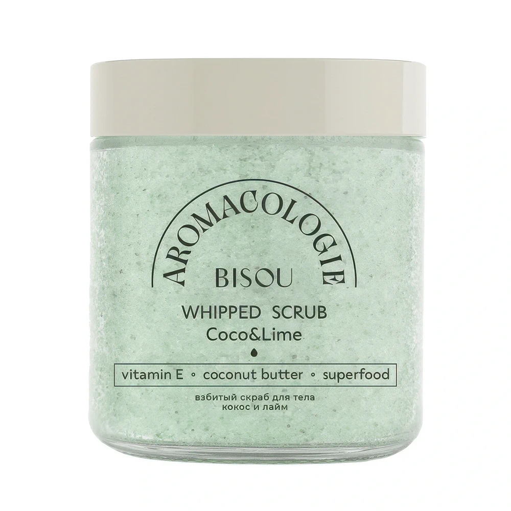 BISOU Aromacologie Скраб для тела Взбитый, Кокос-Лайм – 250 мл. Этот взбитый скраб для тела сочетает в себе экзотические ноты кокоса и освежающий лайм. Он мягко отшелушивает омертвевшие клетки кожи, делая её гладкой и увлажненной. Формула, обогащенная натуральными ингредиентами, помогает стимулировать циркуляцию крови и улучшает текстуру кожи. Кокосовая основа обеспечивает питательные и увлажняющие свойства, а лайм дарит освежающий аромат и бодрящий эффект. Подходит для всех типов кожи и обеспечивает ощущение свежести и комфорта после использования.