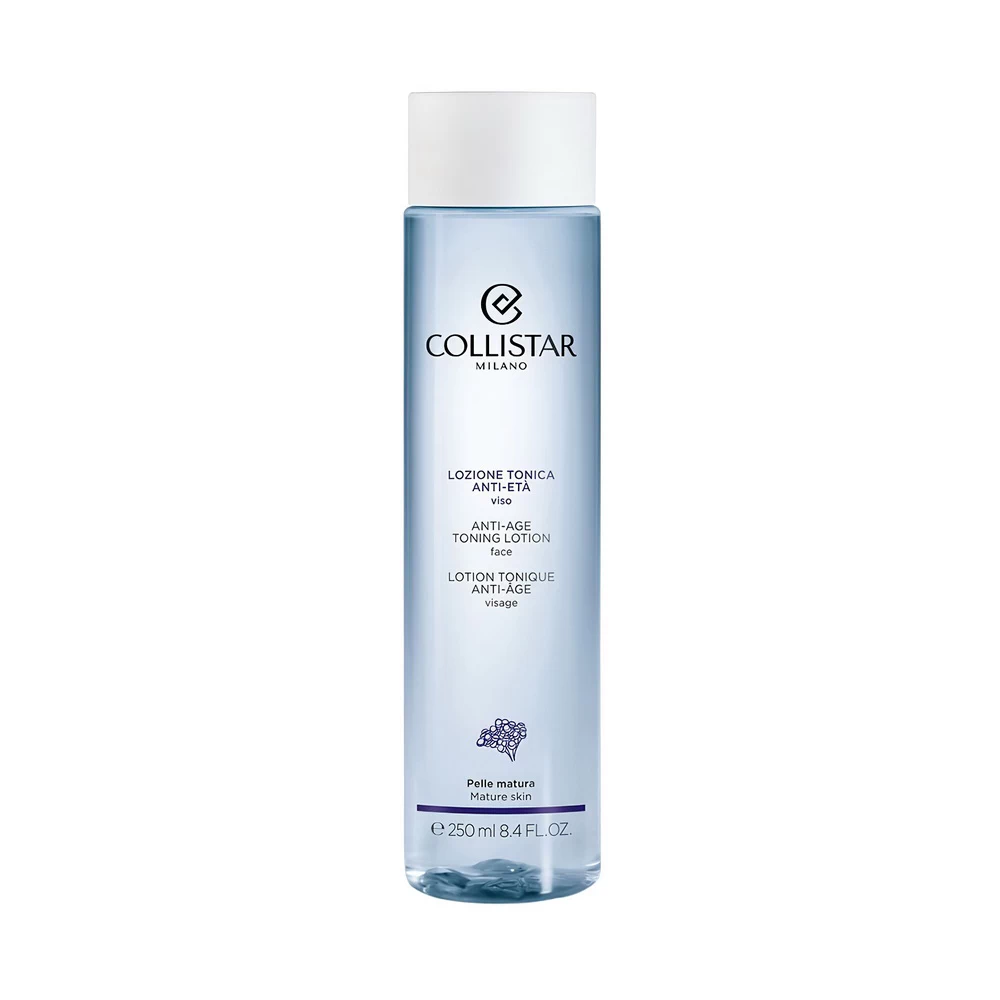 Collistar Face Tonic Anti-Age & Toning — антивозрастный тоник, завершающий очищение, тонизирующий, увлажняющий и придающий коже сияние. Мягко удаляет остаточные примеси, сужает поры, восстанавливает pH и готовит лицо к средствам ухода. Подходит для всех типов кожи, в частности, чувствительной и зоны вокруг глаз.