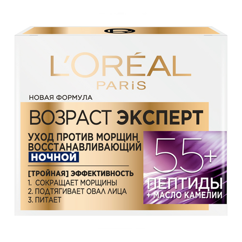 Восстанавливающий уход против морщин Возраст Эксперт 55+ создан специально для ухода за кожей после 55 лет и визуально устраняет возрастные признаки. Пептиды стимулируют выработку эластина, способствуя восстановлению упругости и укреплению кожи. Масло камелии способствует интенсивному питанию и мягкости кожи.
