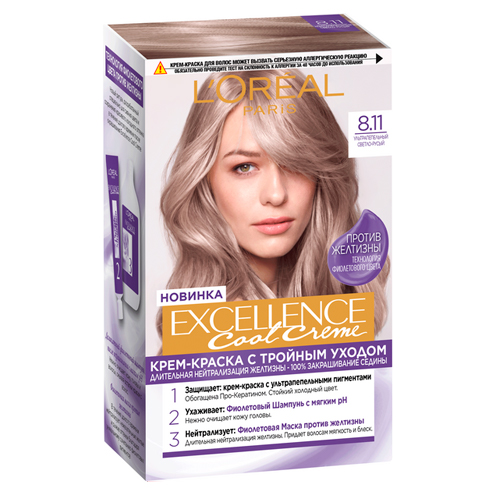 Sarg'ish va qoramag'izlar uchun o'ta kul rangdagi doimiy krem soch bo'yog'i Excellence Cool Creme 8.11, Ultra-ashy Light Blonde - 100% kulrang qoplama va bosh terisi va sochlar uchun uch karra parvarish: 1. Ultra-kulrang pigmentli himoya krem-soch bo'yog'i, Sochni bo'yash paytida himoya qilish uchun Pro Keratin va himoya zardobi bilan boyitilgan. Boy va doimiy sovuq rang; 2. Yumshoq pH bilan bo'yalgandan keyin nozik binafsha rangli shampun bosh terisi va sochni nozik tarzda tozalaydi, sochlardagi qolgan bo'yoqlarni yuvadi. Rang yorqinligini oshirish va Excellence Cool Creamni bo'yashdan keyin uzoq vaqt davomida chiroyli sovuq ohangni saqlab qolish uchun maxsus ishlab chiqilgan yangi parvarish marosimi; 3. Binafsha rangga qarshi sariq niqob binafsha rang pigmentlarning noyob birikmasi tufayli vaqt o‘tishi bilan kiruvchi sariq va qizil ranglarni neytrallaydi va sochlarni og‘irlashtirmasdan yumshoq va porloq qiladi.