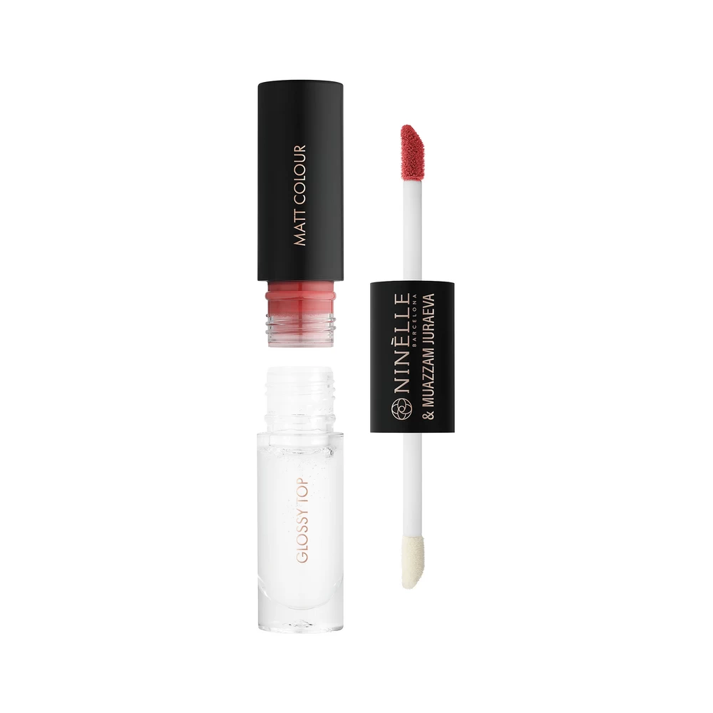Стойкая жидкая помада-блеск состоит из двух частей: цветной матовой помады с насыщенным оттенком и прозрачного топа, который подарит дополнительный блеск со стеклянным сиянием.