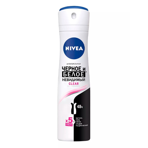 Дезодорант-антиперспирант Nivea «Черное и белое» Невидимый Clear с улучшенной формулой и 5ю действиями защиты – от запаха, пота, пятен и следов на одежде, раздражения. Защита от неприятного запаха 48 часов. И никаких белых следов на черном и желтых пятен на белом, чтобы ты чувствовала себя уверенно каждый день!