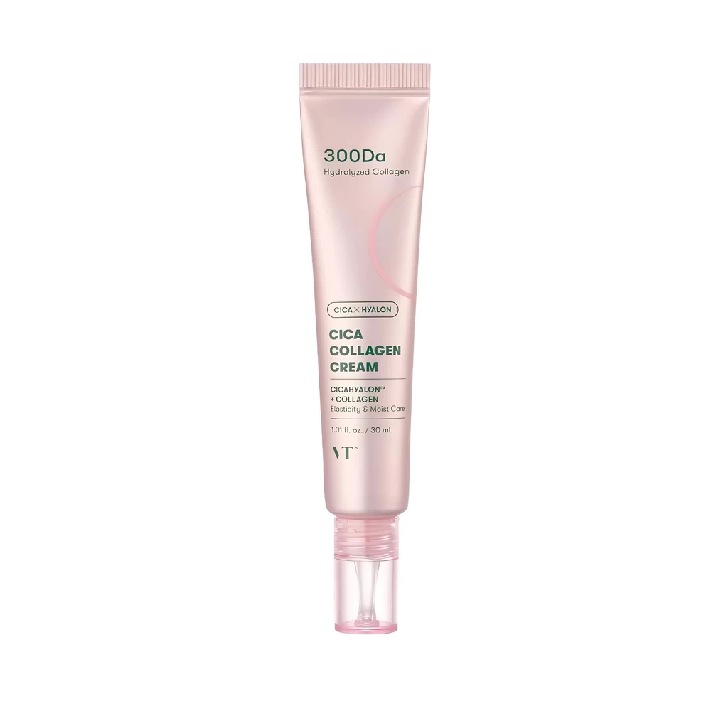 Крем VT Cica Collagen Cream от VT Cosmetics — это передовой корейский крем для лица, который сочетает в себе низкомолекулярный морской коллаген (300 Да) и концентрированный комплекс центеллы азиатской для восстановления эластичности, снятия раздражений и обеспечения глубокого увлажнения даже для чувствительной или зрелой кожи.
