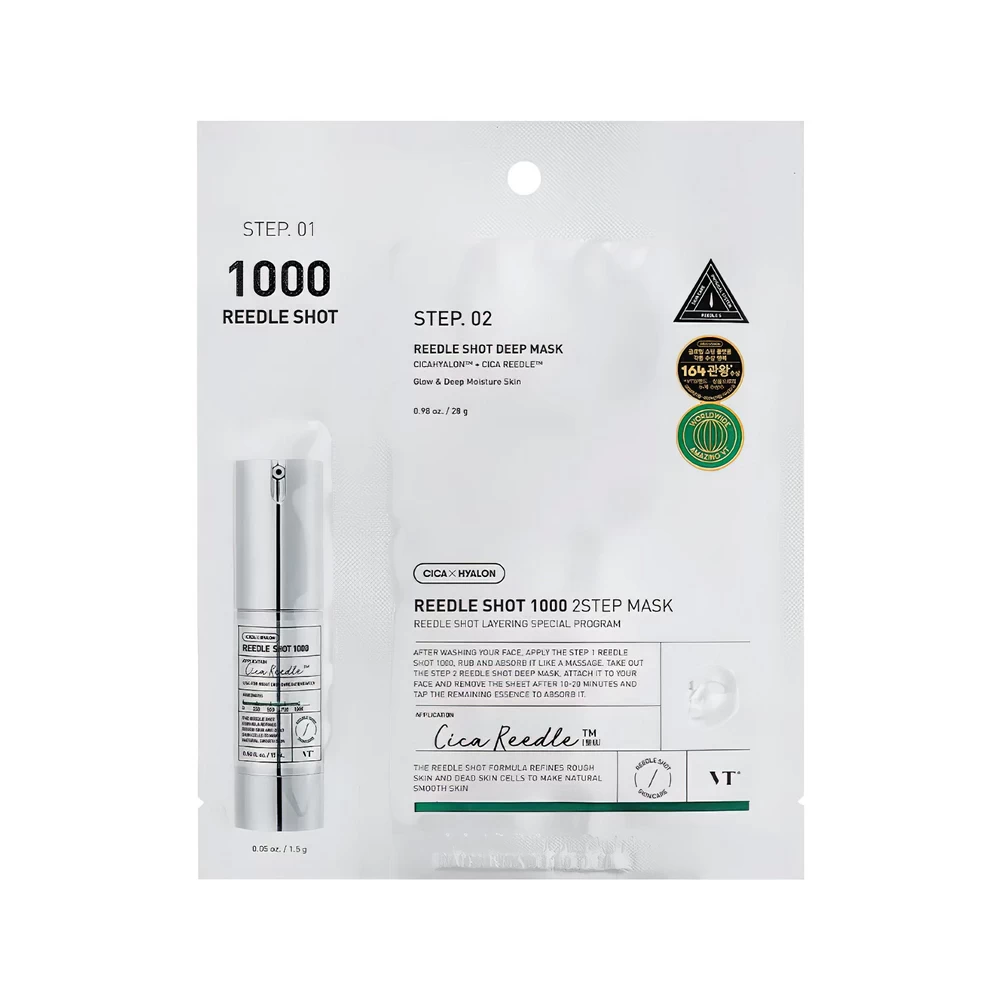 VT Reedle Shot 1000 2-Step Mask Двухступенчатая маска с спикулами для интенсивного обновления кожи (21,5 мл) — мощный экспресс-уход с увеличенной концентрацией морских спикул. Первый этап активирует кожу: микроиглы мягко проникают в верхние слои, стимулируют регенерацию и повышают восприимчивость к питательным веществам. Второй этап — тканевая маска с коллагеном и увлажняющими компонентами, которая глубоко питает, укрепляет и выравнивает кожу.