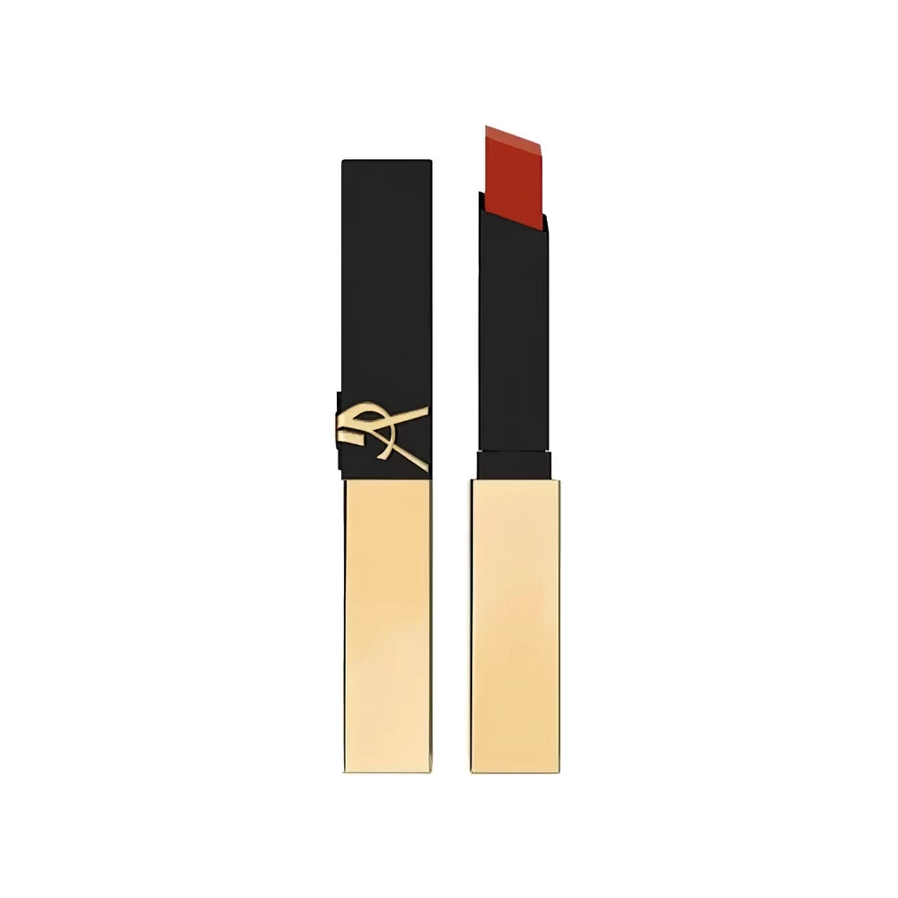 Yves Saint Laurent The Slim Couture Matte Lipstick — матовая помада haute couture. Изысканность и роскошь во всем — в элегантном черно-золотом тюбике с узнаваемым логотипом и фирменной квадратной форме стика, в ласкающей шелковистой текстуре, в насыщенных оттенках и заботливом уходе за кожей. Тонким насыщенным слоем помада ложится на губы, словно вторая кожа. До 10 часов она остается безупречной, не размазываясь и не выцветая.